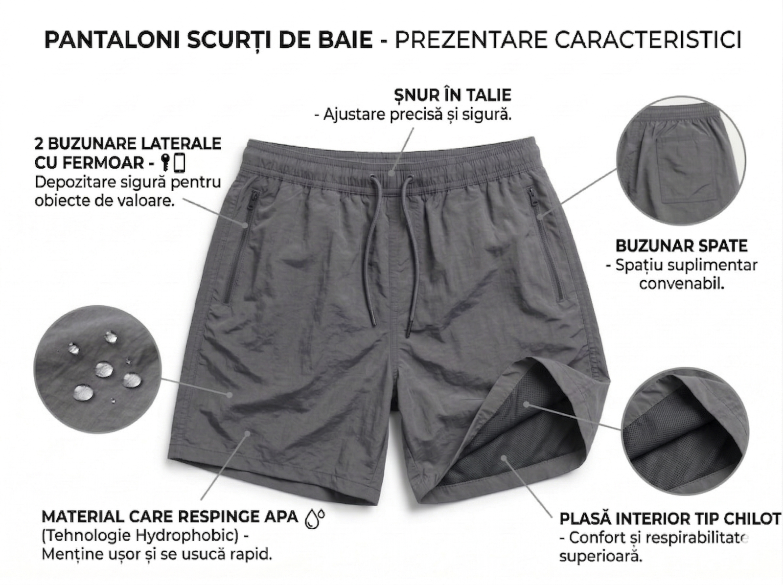 Designul modern, talia reglabila cu snur si buzunarele laterale imbina stilul cu functionalitatea, oferindu-ti un aspect cool si practic. Fie ca iti petreci ziua pe nisip sau in apa, acest costum de baie te va face sa te simti relaxat si increzator.