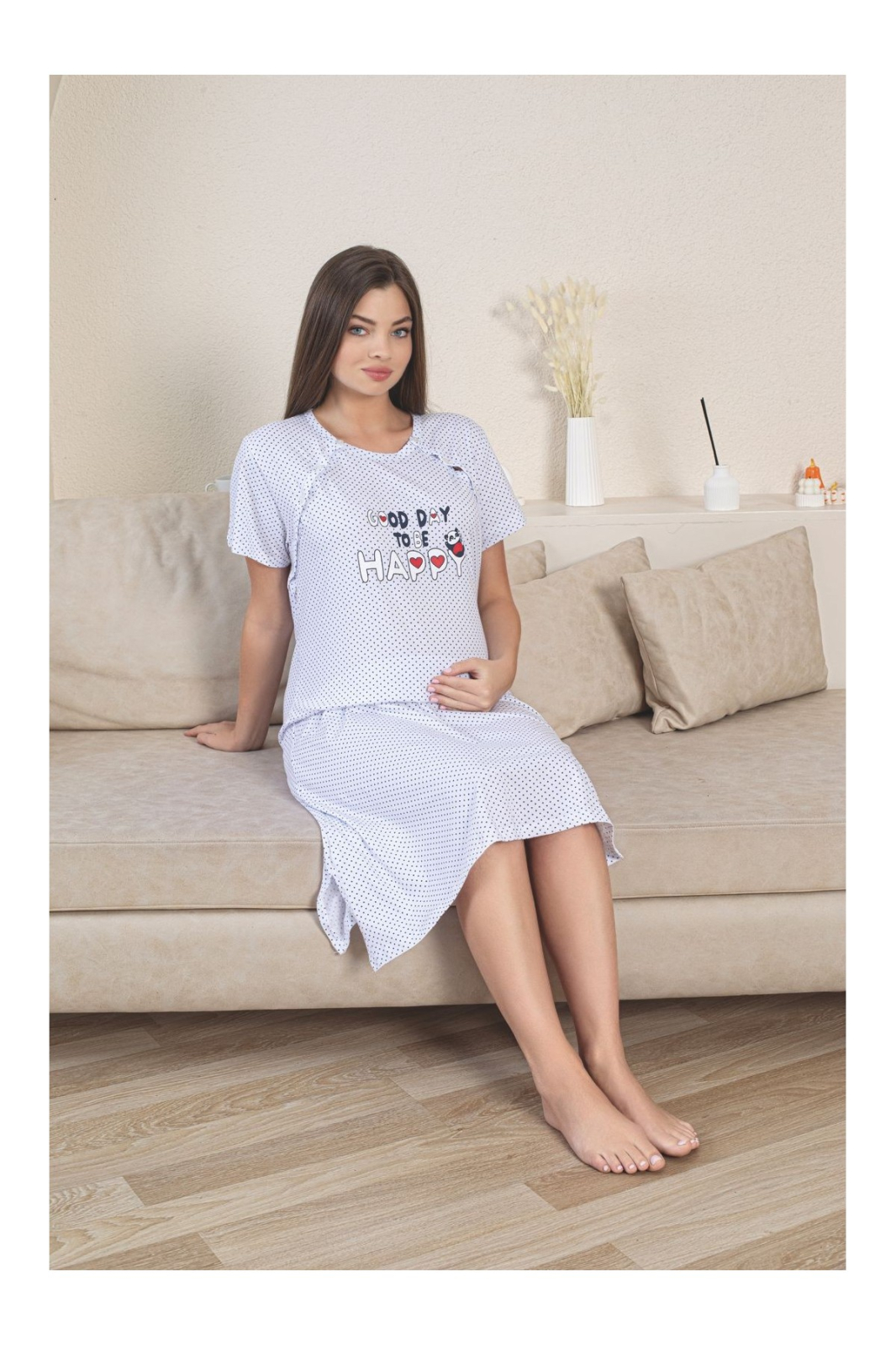 Conceputa cu gandul la nevoile viitoarelor si proaspetelor mamici, aceasta camasa de noapte combina perfect functionalitatea cu un design plin de duiosie.Materialul moale si respirabil, cel mai probabil din bumbac de calitate, mangaie pielea si asigura un somn odihnitor, esential in perioada maternitatii.