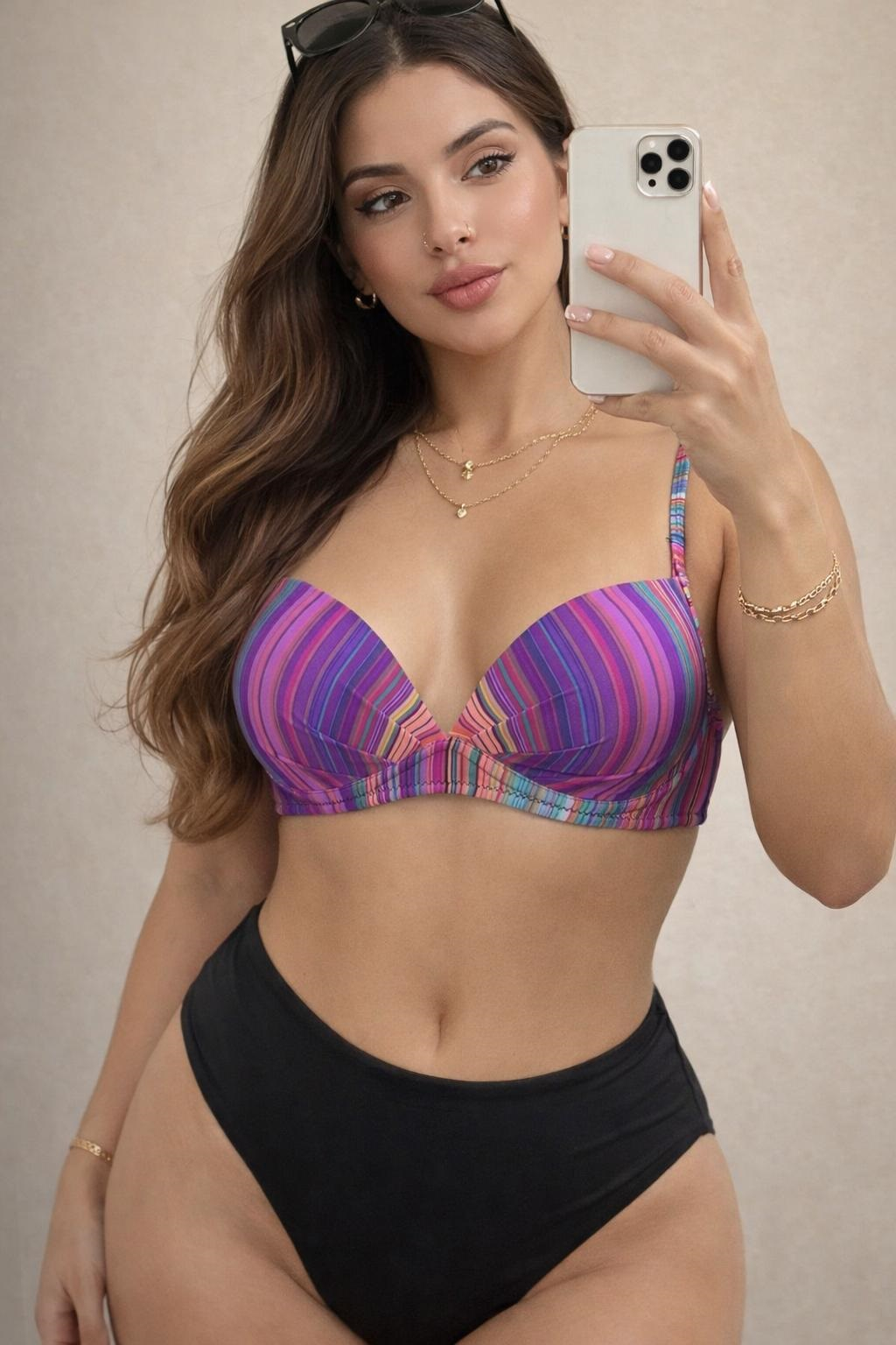 • Top cu sustinere: Sutien tip balconette/cupe intarite, cu imprimeu vesel in dungi multicolore si bretele confortabile.