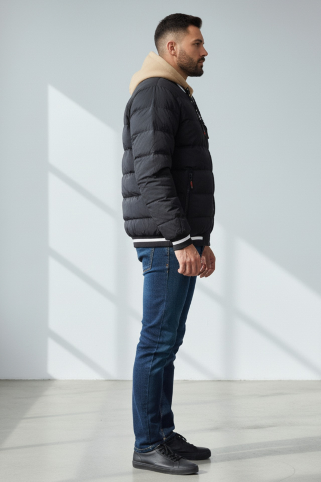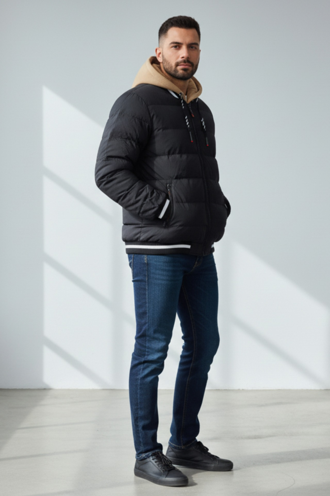Culoarea neagra versatila este usor de asortat, in timp ce gluga contrastanta de culoare bej, in stil hanorac, ofera un detaliu vizual puternic si un aspect stratificat, modern. Materialul matlasat de inalta calitate te protejeaza eficient de vant si temperaturi scazute.