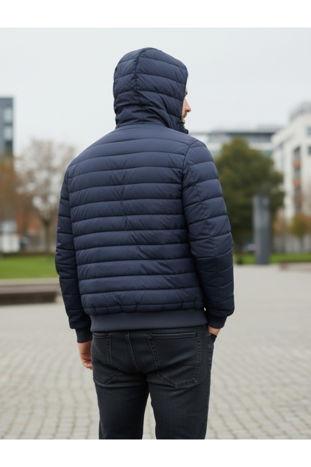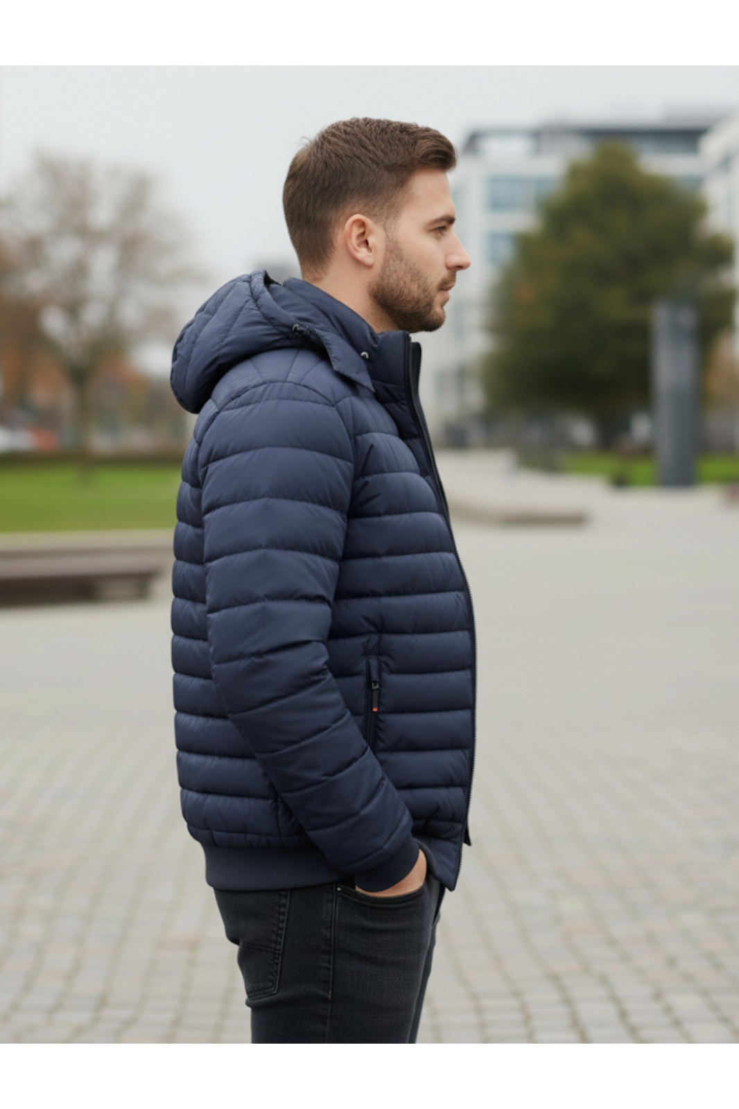 Geaca Matlasata pentru Barbati , cu gluga detasabila, buzunare cu fermoar bleumarin 88915