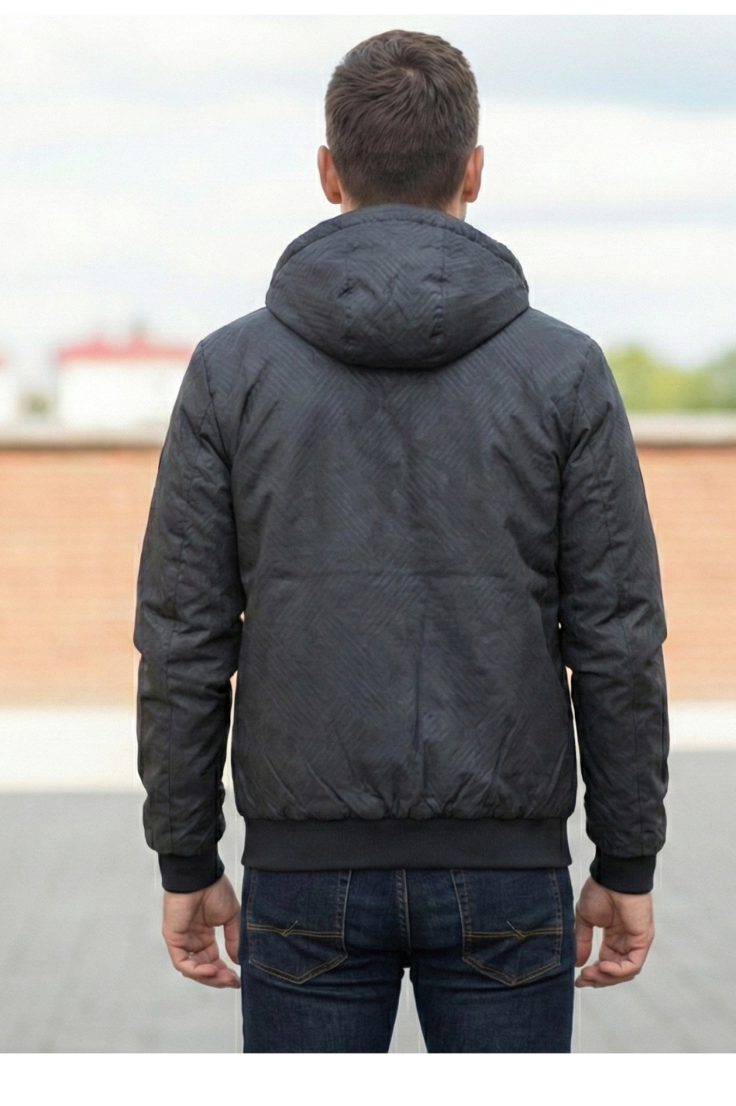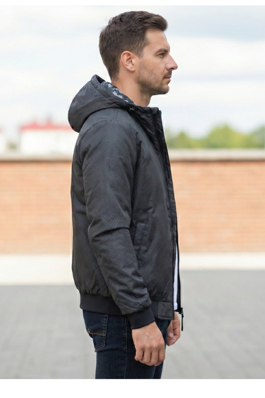 Geaca barbati cu doua fete, gluga fixa si imprimeu montan/ negru uni 62504