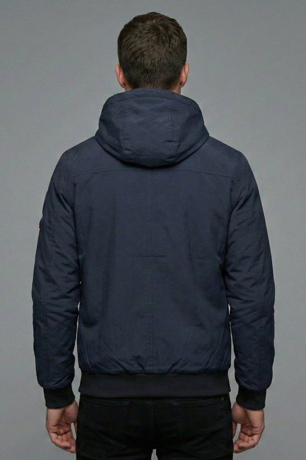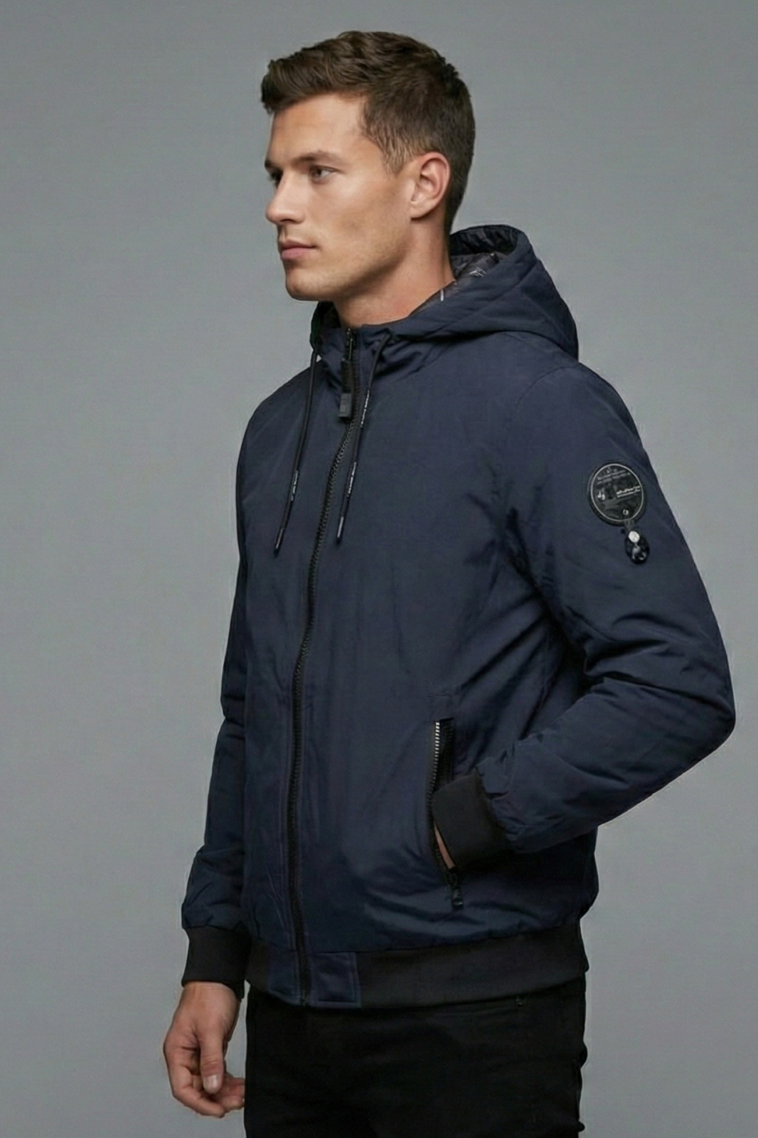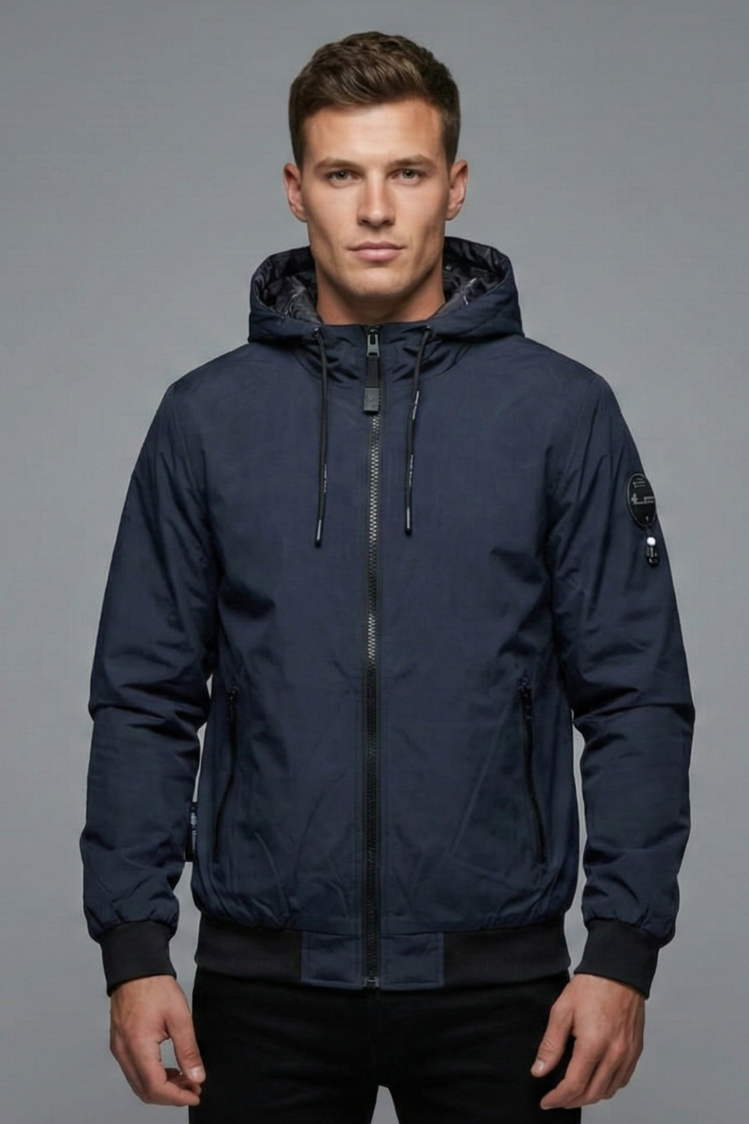 Detalii Premium: Emblema stilizata pe maneca stanga si fermoare negre discrete.