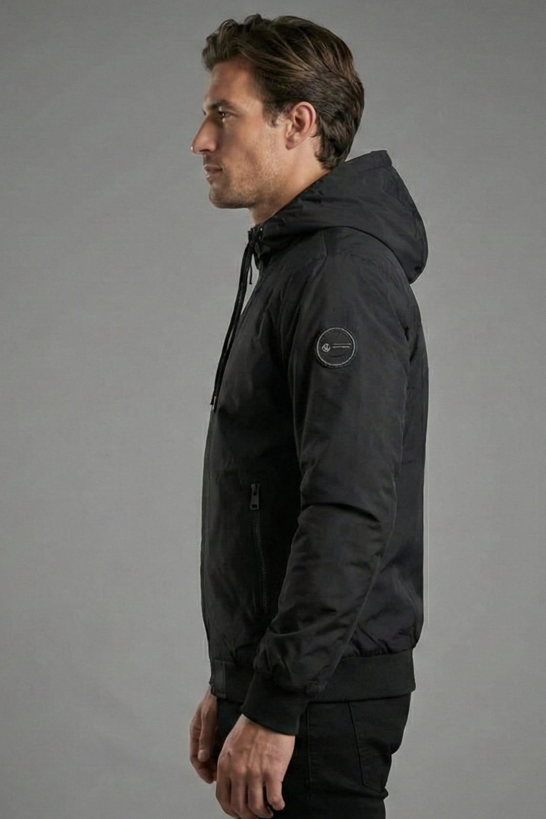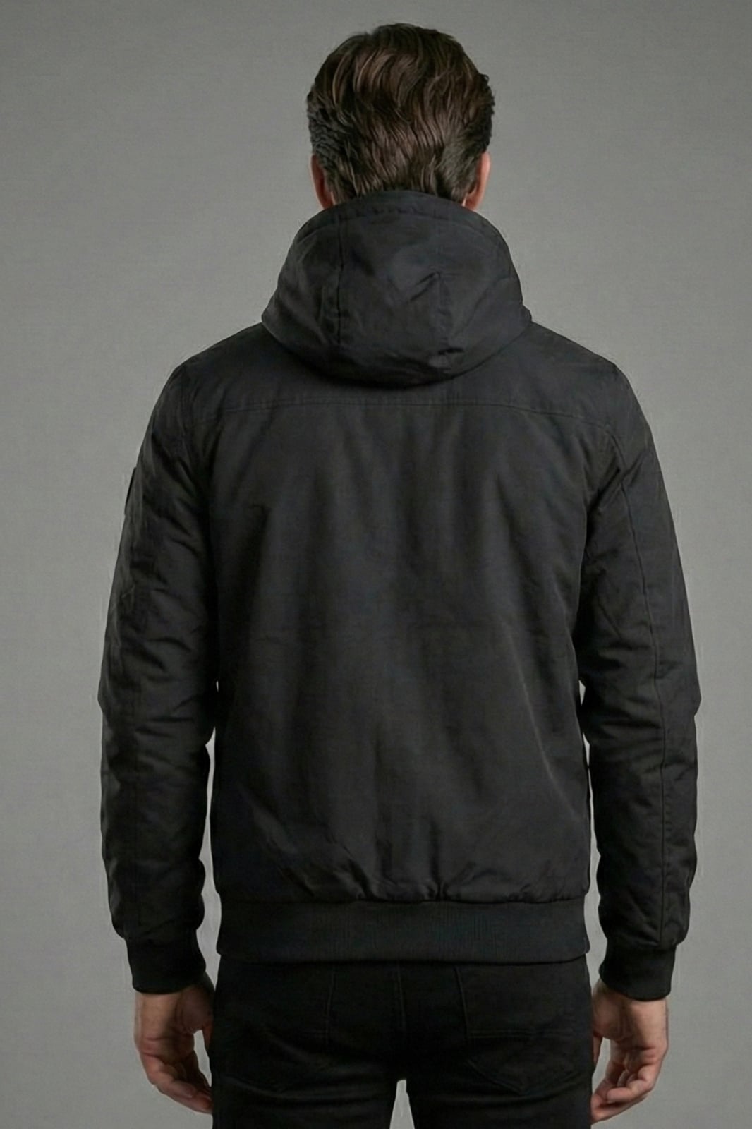 Geaca barbati din fas subtire cu gluga fixa si buzunare cu fermoar negru 7171