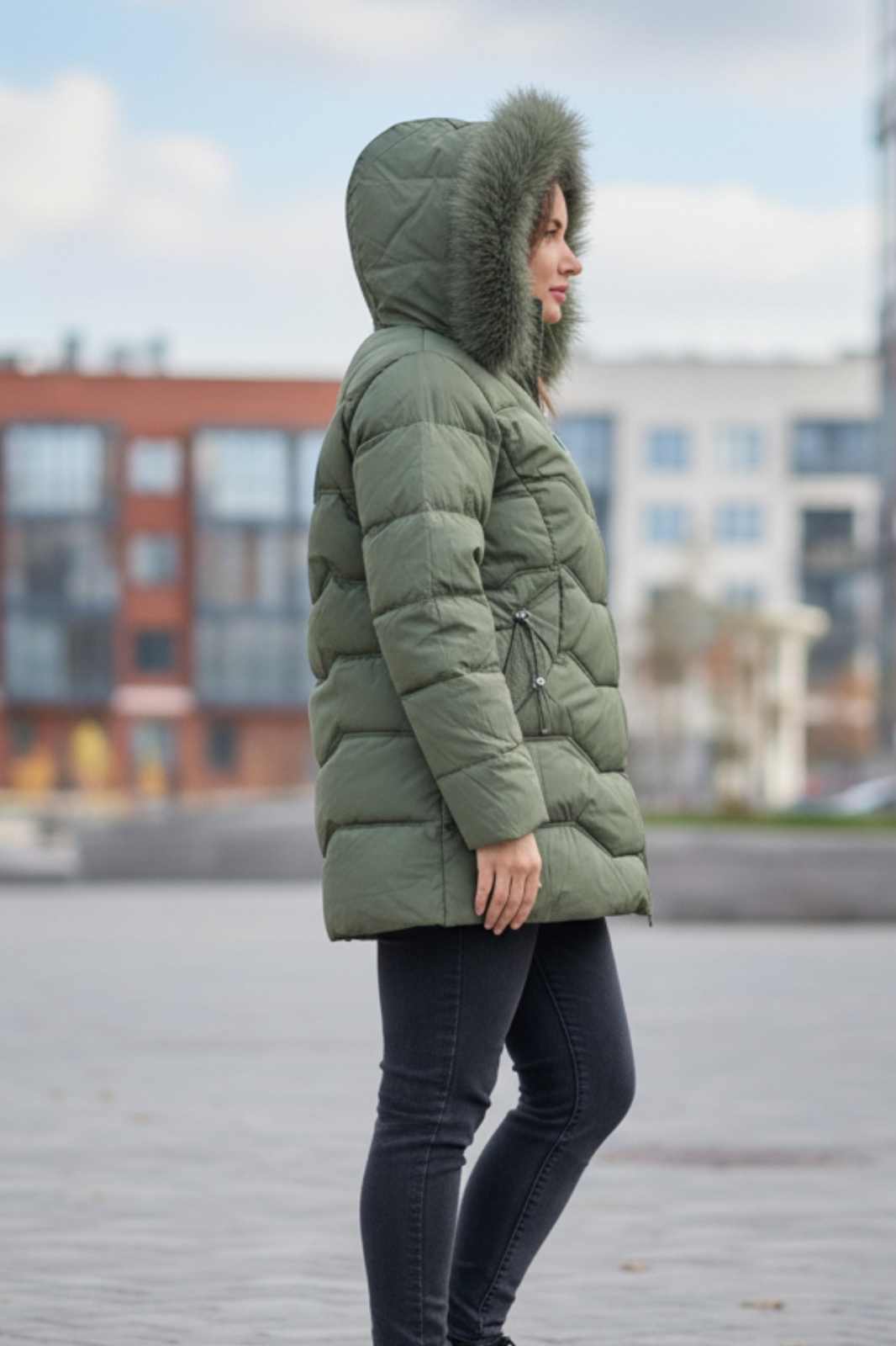 Descriere: Geaca de iarna pentru femei, eleganta si calduroasa, perfecta pentru zilele reci. Realizata dintr-un material rezistent, aceasta geaca neagra ofera confort si stil. Gluga este imblanita cu blana artificiala, adaugand o nota de rafinament si protectie suplimentara impotriva frigului. Designul matlasat asigura o izolatie termica excelenta, mentinandu-va calduroasa.