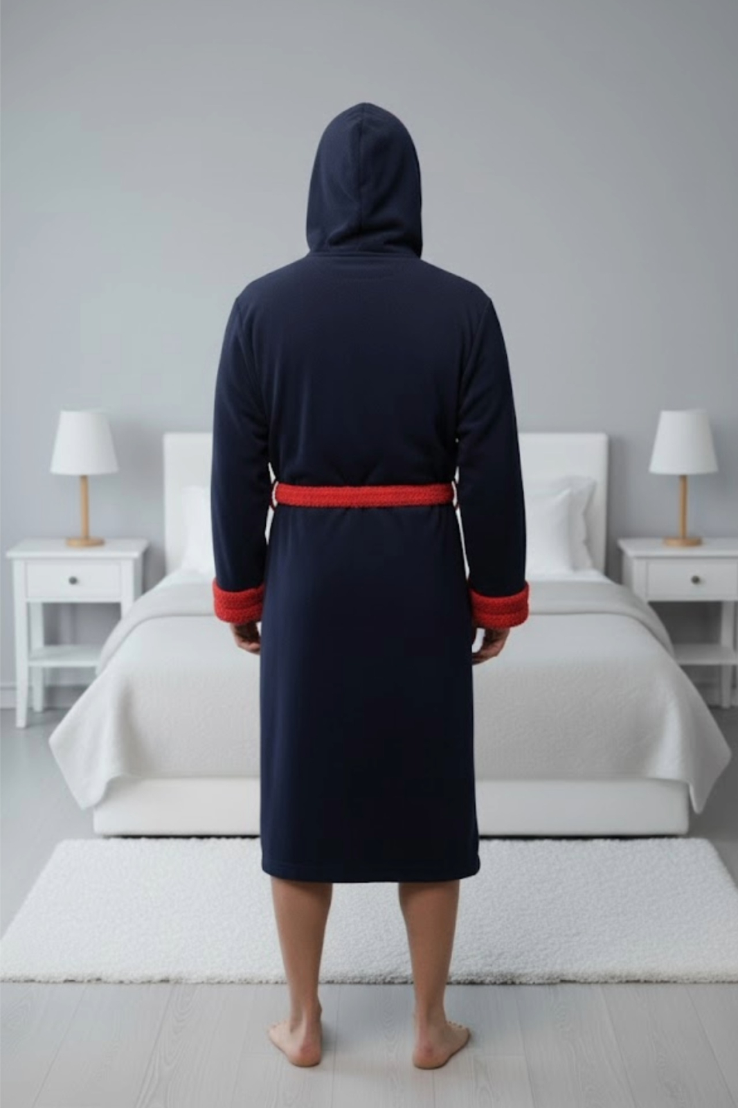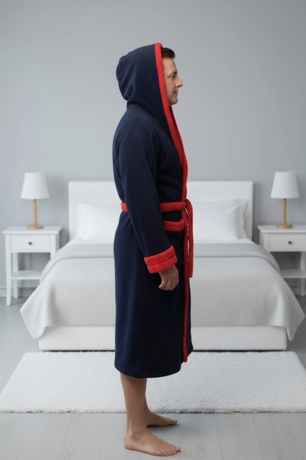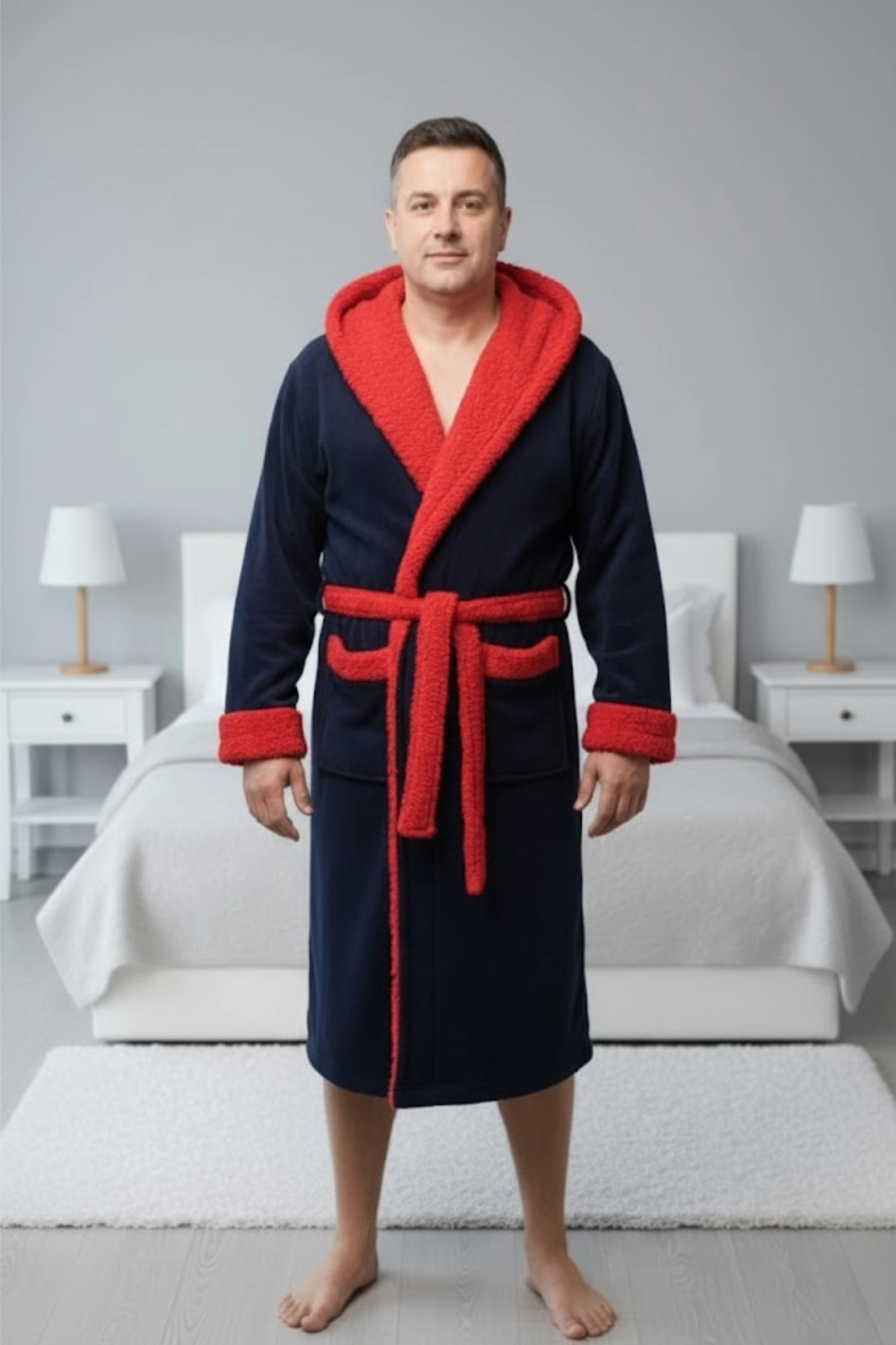 Halat barbat cocolino, material moale si pufos, cu buzunare si gluga, rosu/bleumarin