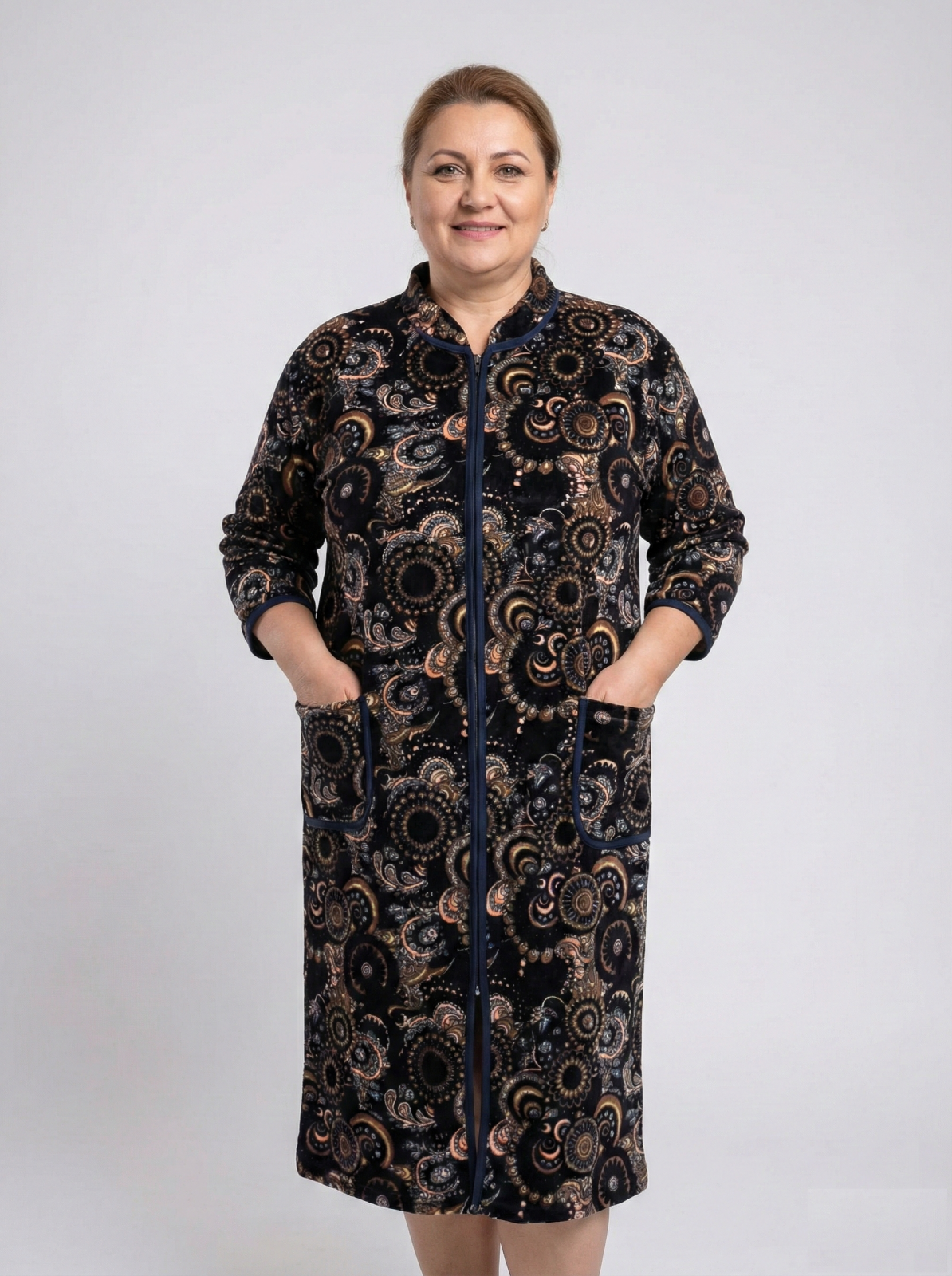 Imbratisati confortul si stilul in zilele racoroase cu acest superb capot de casa, special conceput pentru doamnele cu forme generoase. Realizat dintr-o catifea moale si calduroasa, acest halat va va invalui intr-o senzatie placuta de caldura si rasfat, fiind perfect pentru diminetile de weekend sau serile de relaxare.