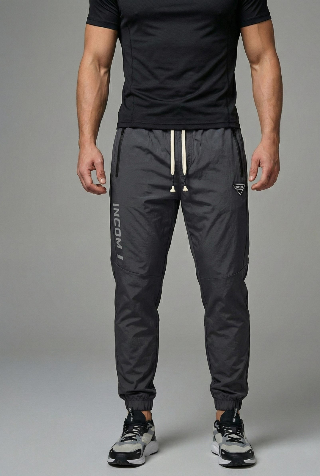 Detalii stilistice: Imprimeu vertical text "INCOM" pe piciorul drept si logo triunghiular discret pe partea stanga.