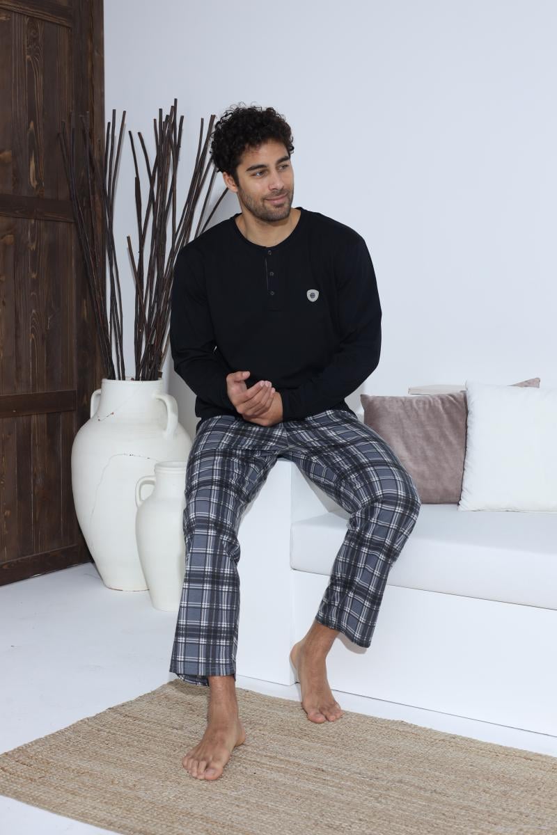 Pijama lunga bumbac pentru barbati cu buzunare la pantaloni, negru 70021