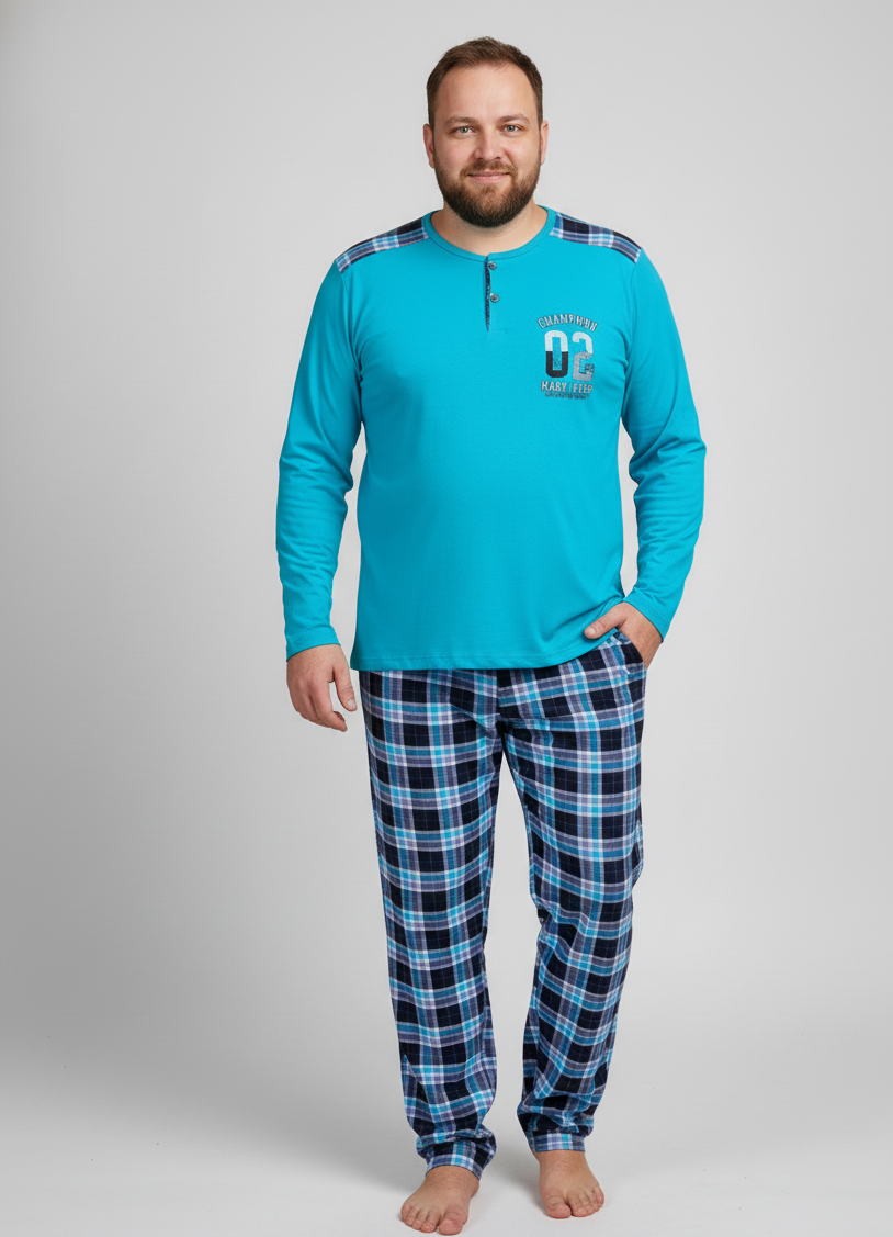 Pijama lunga bumbac fin si calitativ marime mare, buzunare la pantaloni 205 albastru carouri