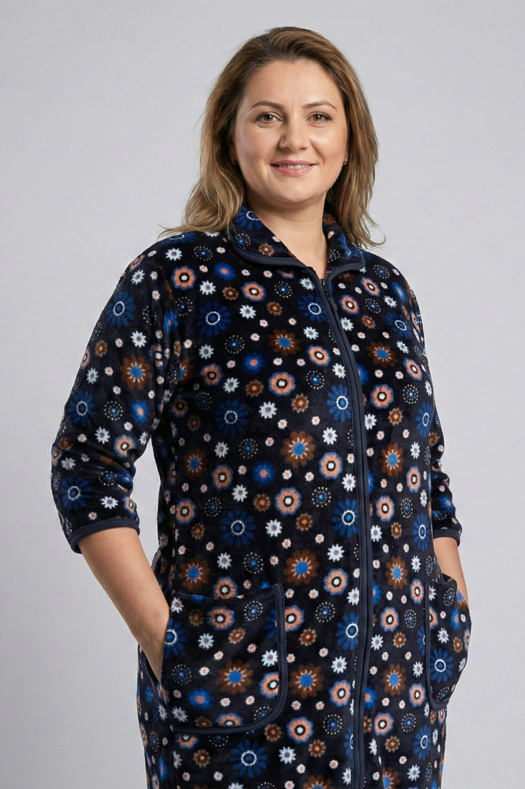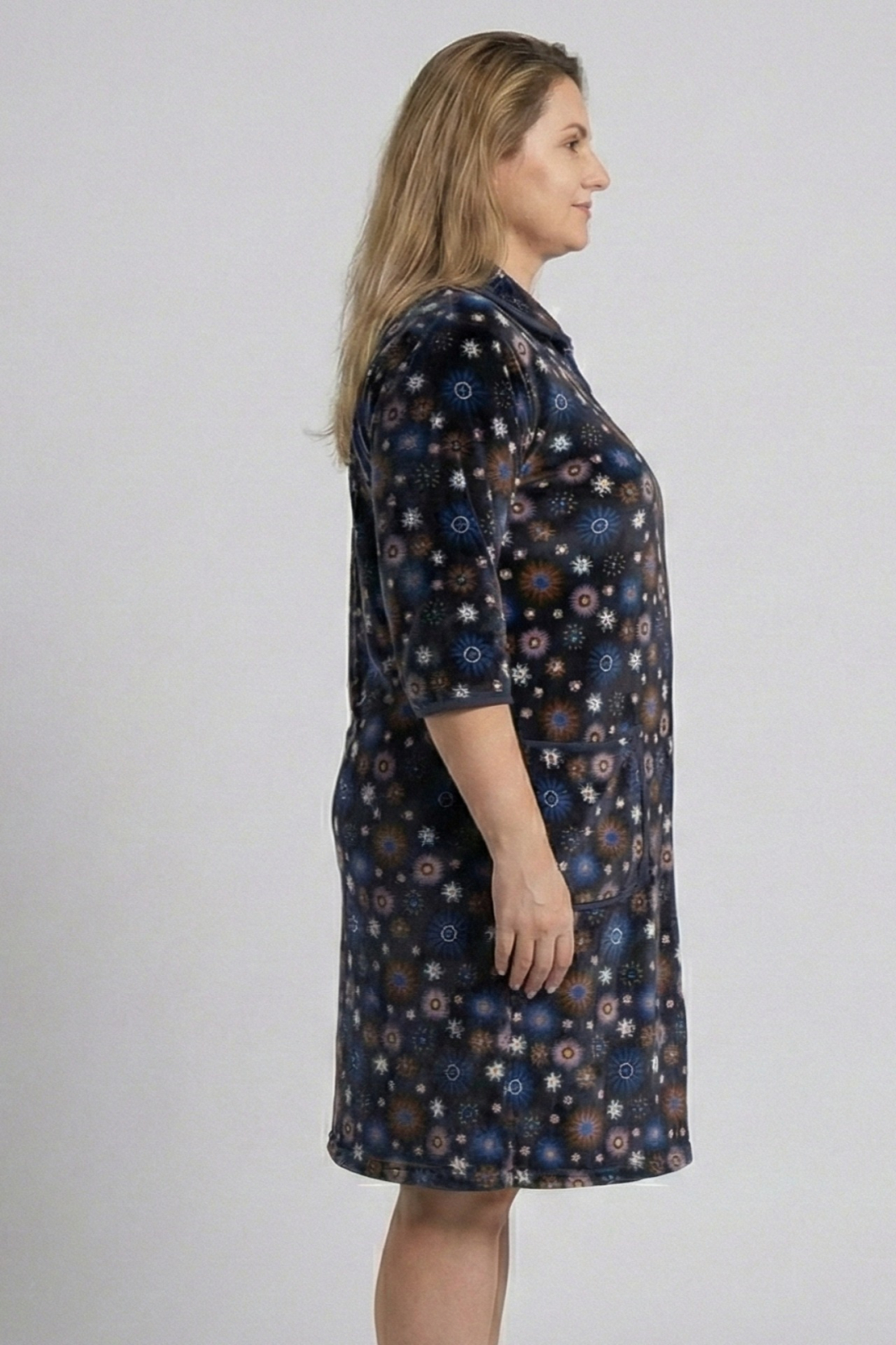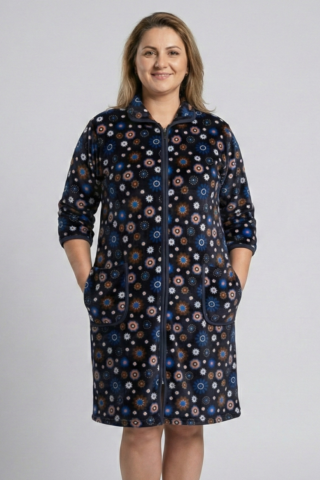 Imbratisati confortul si stilul in zilele racoroase cu acest superb capot de casa, special conceput pentru doamnele cu forme generoase. Realizat dintr-o catifea moale si calduroasa, acest halat va va invalui intr-o senzatie placuta de caldura si rasfat, fiind perfect pentru diminetile de weekend sau serile de relaxare.