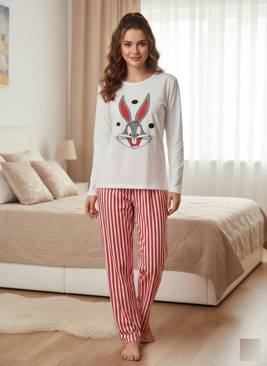 Pijama bumbac de Dama Confortabila, Set cu Bluza si Pantaloni lungi, alb/rosu 3734