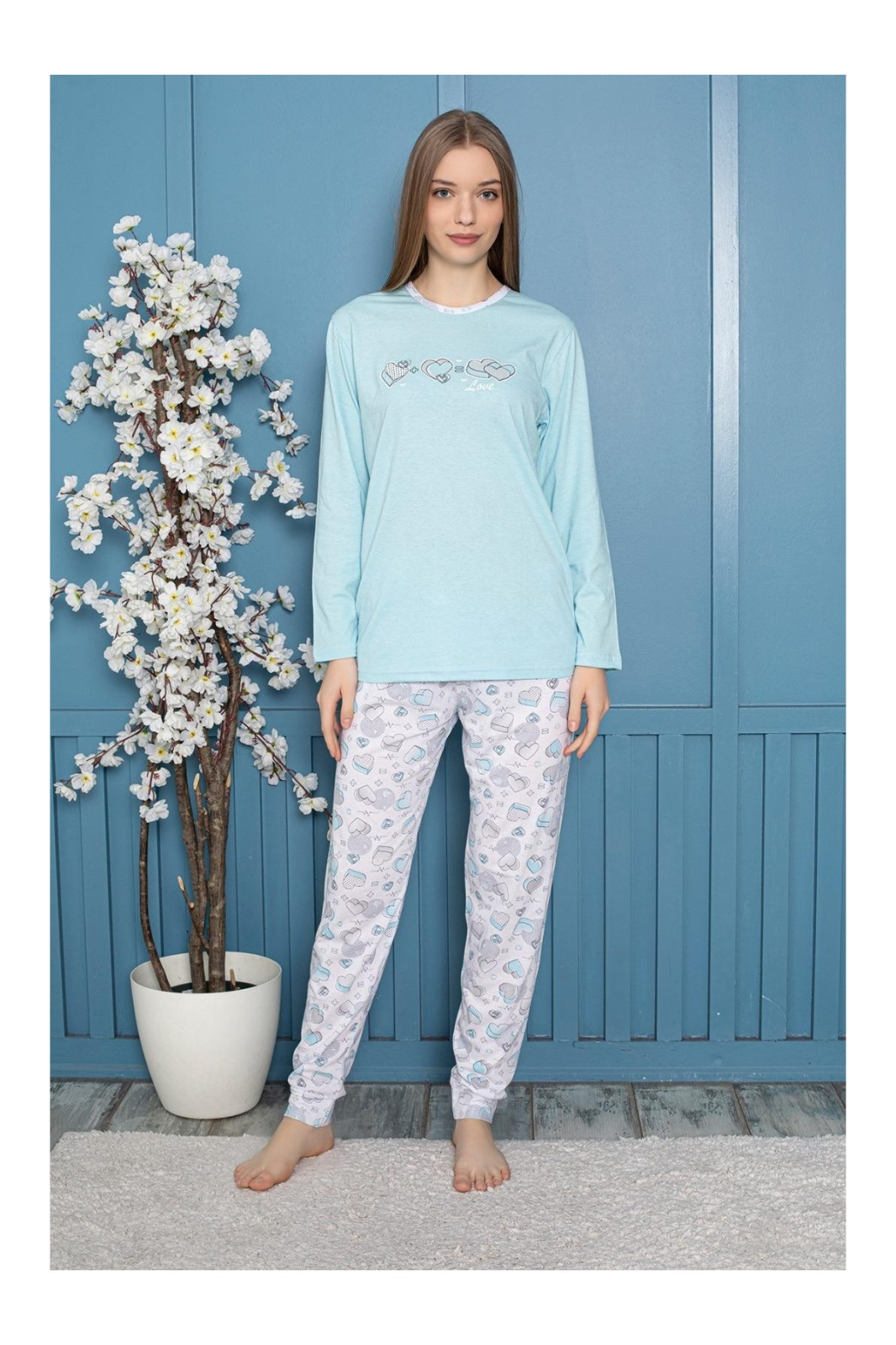 Pijama bumbac de Dama Confortabila, Set cu Bluza si Pantaloni lungi, albastru 806