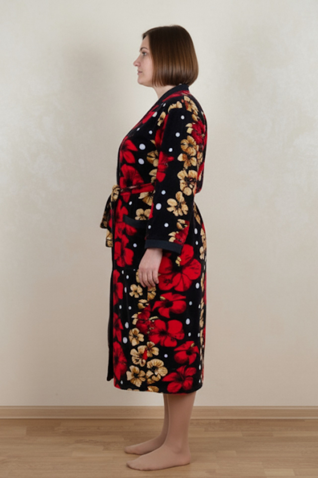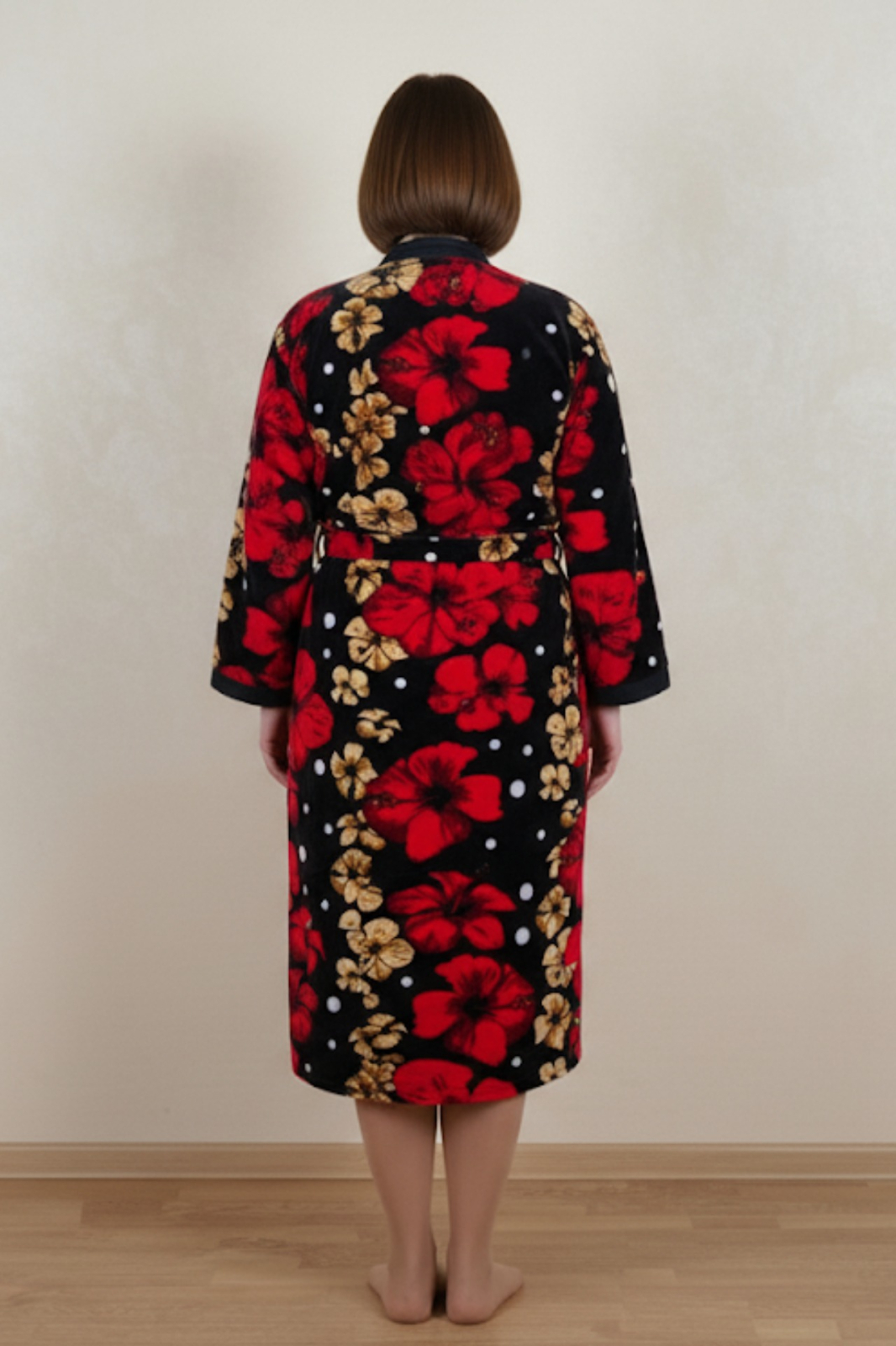 Designul sau se remarca prin imprimeul floral vibrant, cu flori rosii luxuriante pe un fundal negru elegant, adaugand o nota de rafinament tinutei dumneavoastra de interior. Croiala lejera, inchiderea practica cu nasturi si cordonul ajustabil in talie asigura o potrivire perfecta si confort maxim.